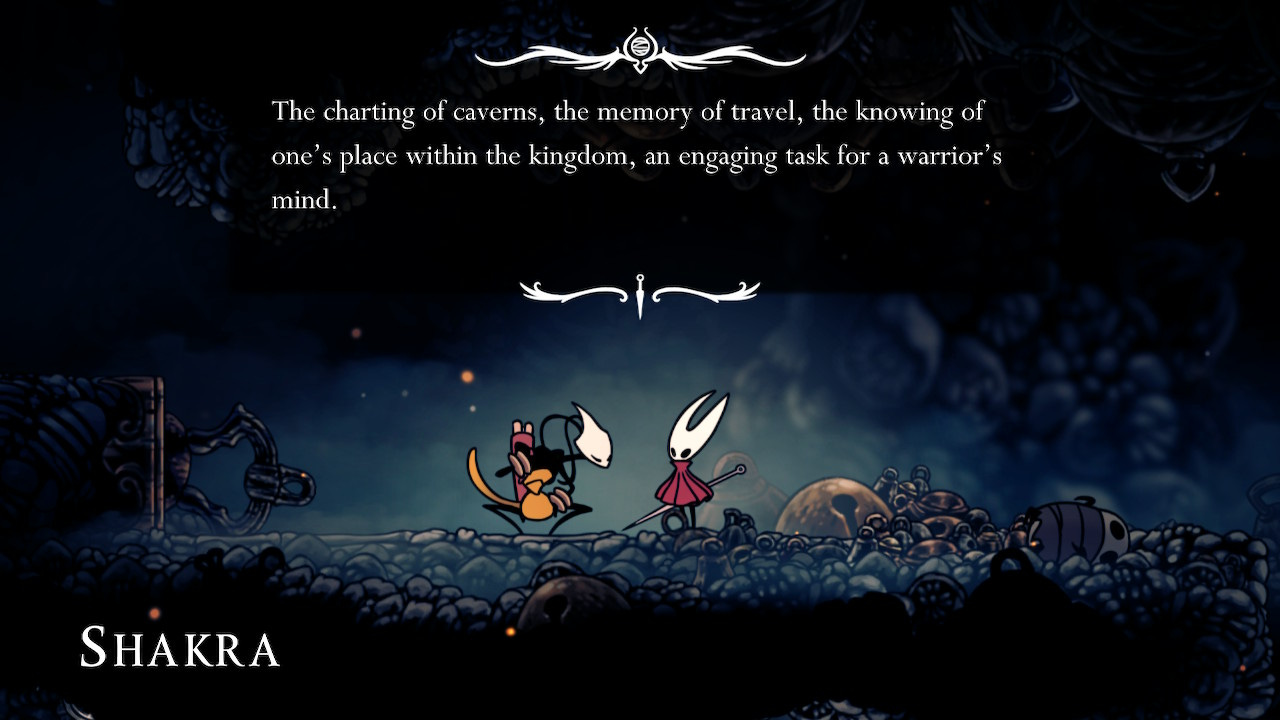 Shakra's quest is personal and mysterious. Several times we will meet them in act one to buy copies of their maps and even to aid each other in battle; but each time, Shakra believes they are getting closer and closer to their master. They claim there is evidence that their master was just here in this spot! Surely we've seen her? We must be so close! Yet we as Hornet cannot see this evidence. Is it really there? Or is it just something we wouldn't recognize?